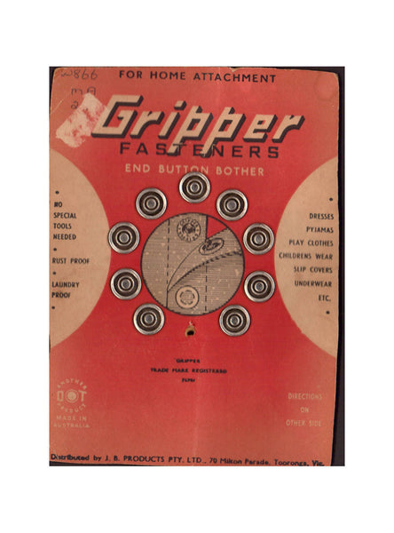 Vintage 50s Gripper Fasteners End Button Bother, 2 cards, missing rings and attachment tool, Made in Australia, Haberdashery Supplies