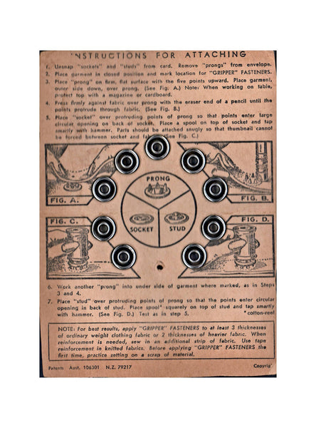 Two packs of vintage Gripper brand fasteners. Card no.2 is missing one fastener. Also missing the attachment tool and rings - so these two cards are useful for collectors or for those who already possess the attachment tool and spare rings. Fabulous retro instructions can be found in picture 3.