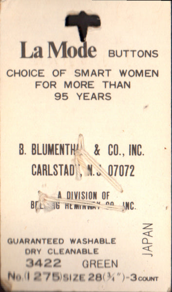 Vintage La Mode 19 mm (3/4 inch) Carded Green Shank Buttons Three Pieces