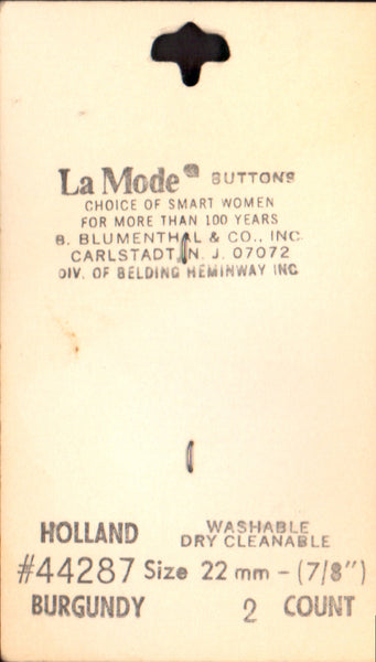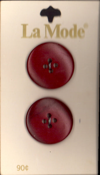 Vintage La Mode 22 mm (approx. 7/8 inch) Carded Burgundy 4-Hole Buttons Two Pieces
