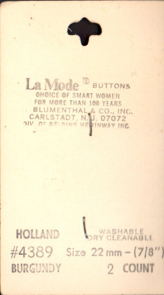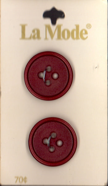 Vintage La Mode 22 mm (approx. 7/8 inch) Carded Raised Burgundy 4-Hole Buttons Two Pieces