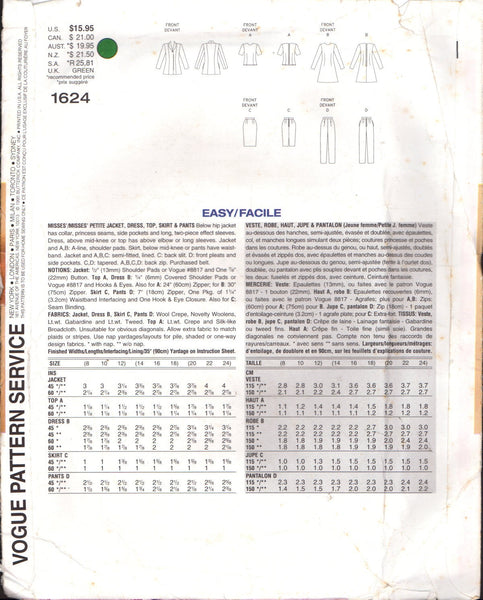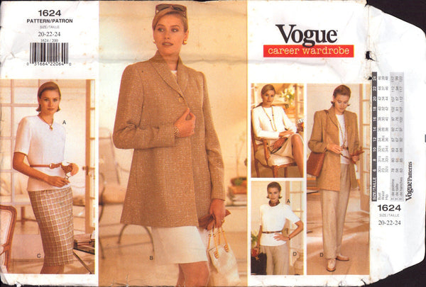 Below hip jacket has collar, princess seams, side pockets and long, two-piece effect sleeves. Dress, above mid-knee or top has above elbow or long sleeves. Jacket and A, B: A-line, shoulder pads. Skirt, below mid-knee or pants have waistband. Jacket and A, B, C: semi-fitted, lined. C: back slit. D: front pleats and side pockets. C,D: tapered. A, B, C, D: back zip.