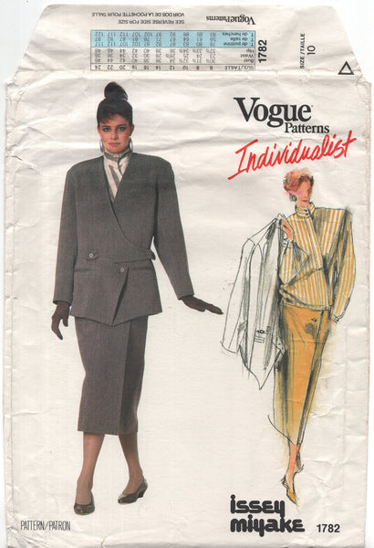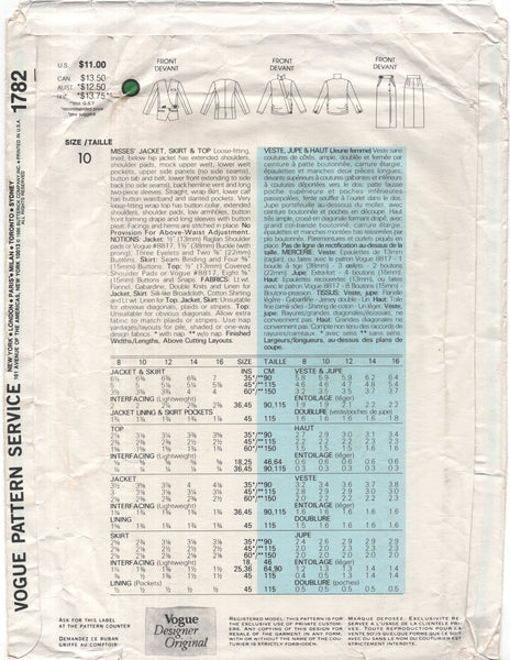 Loose-fitting, lined, below hip jacket has extended shoulders, shoulder pads, mock upper welt, lower welt pockets, upper side panels (no side seams), button tab and belt, lower front extending to side back (no side seams), back hemline vent and long two-piece sleeves. Straight, wrap skirt, lower calf has button waistband and slanted pockets. Very loose fitting wrap top has button collar, extended shoulders, shoulder pads, low armholes, button front forming drape and long sleeves with button pleat. Facings and hems are stitched in place. No Provision for Above Waist Adjustment.