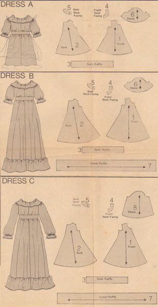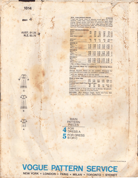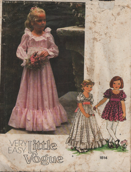 Vogue 1814 Sewing Pattern, Girls' Dress, Size 4, Partially Cut, CompleteThe top flap of the envelope is missing. The pattern is intact.