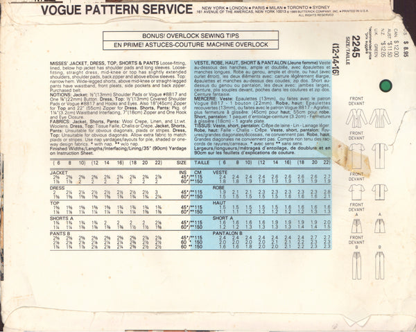 Vogue 2245 Sewing Pattern, Jacket, Dress, Top, Shorts and Pants, Size 12-14, Partially Cut, Complete