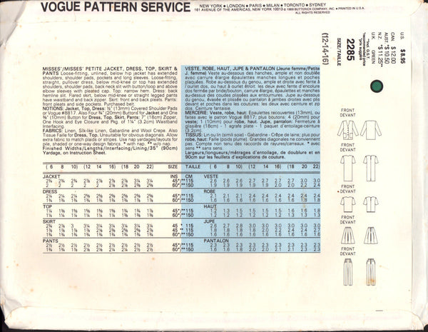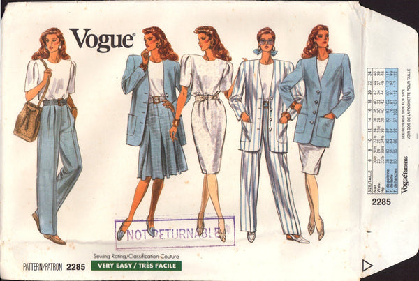 Loose-fitting, unlined, below hip jacket has extended shoulders, shoulder pads, pockets and long sleeves. Loose-fitting straight, pullover dress below mid-knee or top has extended shoulders, shoulder pads, back neck slit with button/loop and above elbow sleeves with pleated cap. Top: narrow hem. Dress: back hemline slit. Flared skirt below mid-knee or straight legged pants have waistband and back zipper. Skirt: front and back pleats. Pants: front pleats and side pockets.