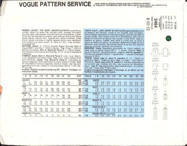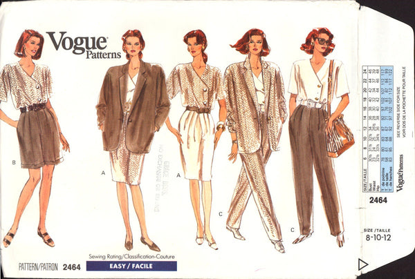Loose-fitting, unlined, below hip jacket has extended shoulders, shoulder pads, pockets and long sleeves. Loose-fitting top , extended shoulders and asymmetrical closing. Tapered skirt, below mid-knee. Cuffed shorts are above mid-knee. Slightly tapered pants, have waistband, front pleats and back zipper.