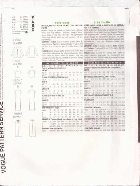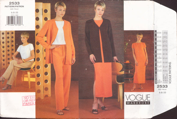 Unlined, above hip jacket has button/loop, stitched hems and long sleeves. Pullover, straight dress, above ankle or top has side slits. Straight-legged pants have elastic waist and side pockets. All are loose-fitting.