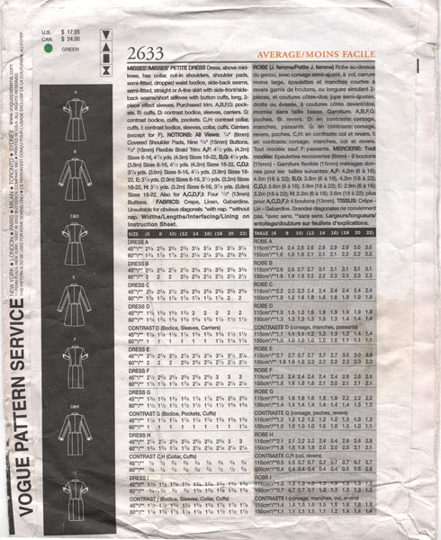 Dresses, above mid-knee, has collar, cut-in shoulders, shoulder pads, semi-fitted, dropped waist bodice, side-back seams, semi-fitted straight or a-line skirt with side-front/side-back seams/short sleeves with button cuffs, long, 2-piece effect sleeves.