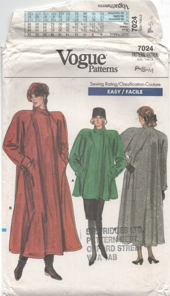 Very loose-fitting, lined 3/4 or above ankle length coat has collar, shoulder pads, welt pockets, back hemline vent, concealed button closing, stitched hems and long, two piece sleeves with cuffs and button trim.