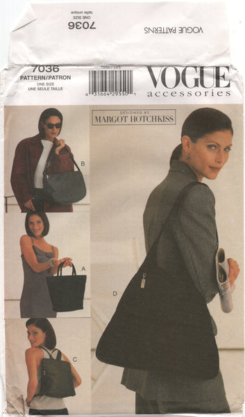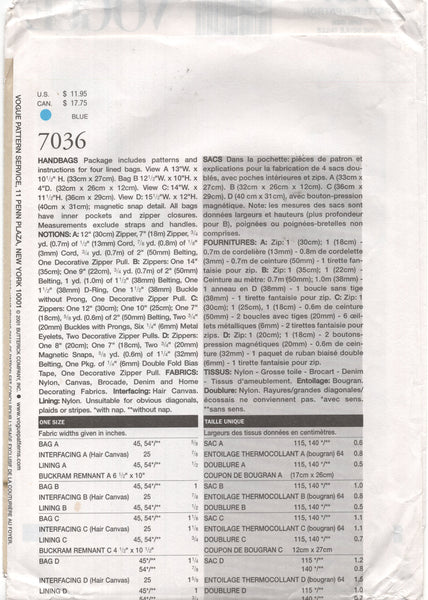 Package includes patterns and instructions for four (4) lined bags. View A: 13"W x 10"H. (33 cm x 27 cm). Bag B: 12.5"W x 10H x 4"D (32 cm x 26 cm x 12cm). View C: 14"W x 11.5"H (36 cm x 29 cm). View D: 15.5"W x 12"H (40cm x 31cm); magnetic snap detail. All bags have inner pockets and zipper closures. Measurements exclude straps and handles.