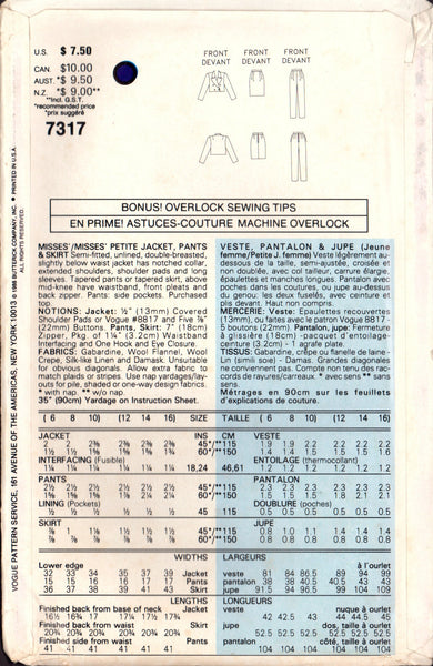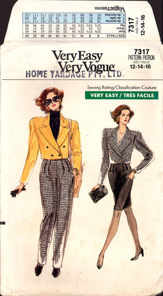 Semi-fitted, unlined, double-breasted, slightly below waist jacket with notched collar, extended shoulders, shoulder pads and long sleeves. Tapered pants or tapered skirt, above mid-knee, have waistband, front pleat and back zipper. Pants: side pockets. Purchased top.
