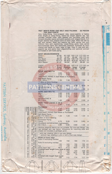 Very loose fitting, front wrapped robe, seven eighths or below knee length or loose fitting, below hip length pajama top, has rounded notched collar, back pleated into one-piece yoke with forward shoulder seams and patch pockets with shaped bands. Full length sleeves have shaped band at lower edge. Robe has self tie belt and carriers. Robe and pajamas top have narrow one inch hem and top stitching. Loose fitting pants have partial front-buttoned band and elasticized waistline, buttoned fly front closing and bands at lower edge of legs. View A robe and belt, pajama top and pants have edge stitching and optional contrast purchased or self made piping.
