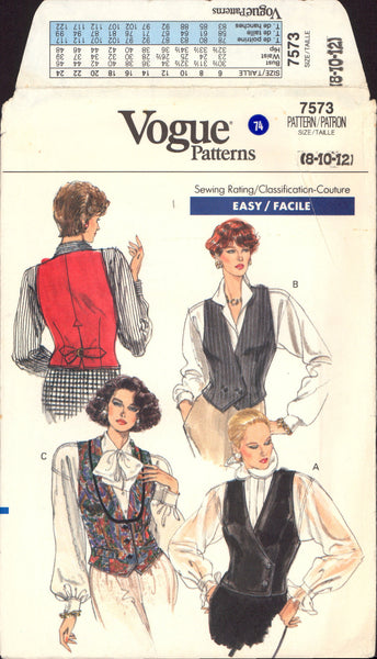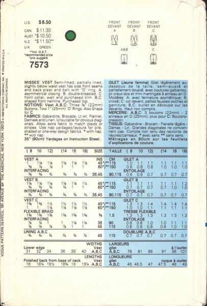 Semi-fitted, partially lined, slightly below waist vest has side front seams and back pleat and belt with "D" ring. A: asymmetrical closing. B: double-breasted. C: front collar, welt and purchased trim. B, C: shaped front hemline. Purchased top.