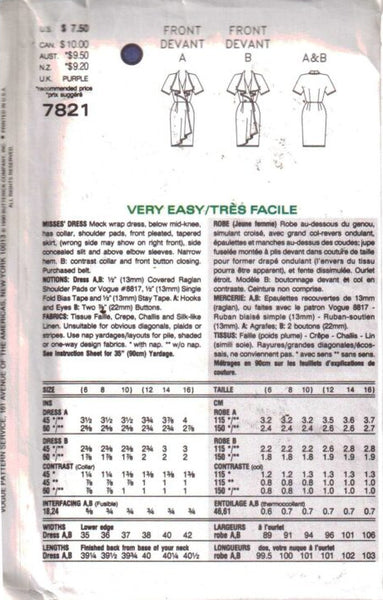 Vogue 7821 Sewing Pattern, Dress, Size 12-14-16, Uncut, Factory Folded