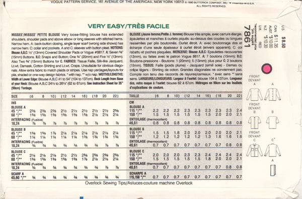 Vogue 7861 Sewing Pattern, Blouse, Size 6-8-10, Cut, CompleteThe pattern has been cut to size 10.