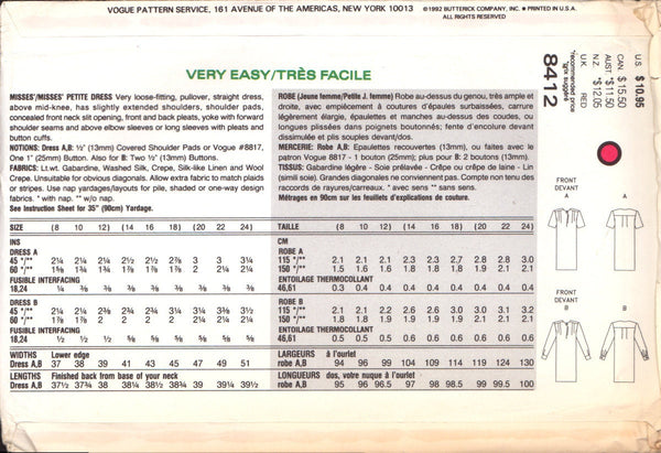 Very loose-fitting, pullover, straight dress, above mid-knee, has slightly extended shoulders, shoulder pads, concealed front neck slit opening, front and back pleats, yoke with forward shoulder seams and above elbow sleeves or long sleeves with pleats and button cuffs.