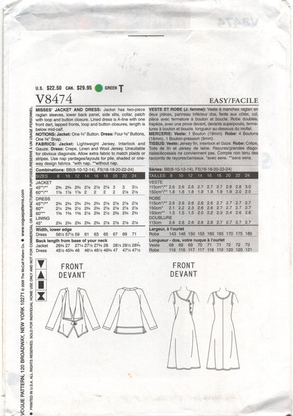 Jacket has two-piece raglan sleeves, lower back panel, side slits, collar, patch with loop and button closure. Lined dress is A-line with one front dart, lapped fronts, loop and button closures, length is below mid-calf.