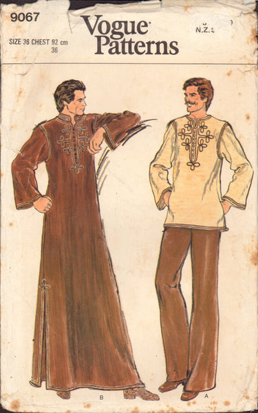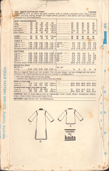 Loose-fitting tunic or caftan, has jewel neckline with or without standing collar, front slit with button and loop closing, straight full length sleeves, pockets in side seams, side slits (caftan only) and braid trim. Purchased pants.