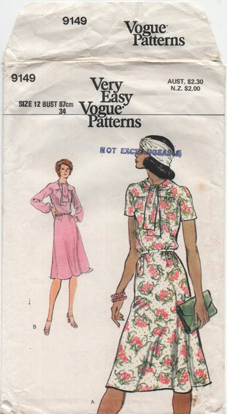 Vogue 9149 Retro 70s A-line Dress with Neckline Tie, Cut, Complete, Sewing Pattern Size 12