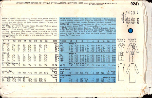 Very loose-fitting, straight dress, below mid-calf or lower calf, has notched collar, dropped shoulders, shoulder pads, pockets and cap sleeves or long sleeves rolled-up (wrong side shows). Purchased hankie.