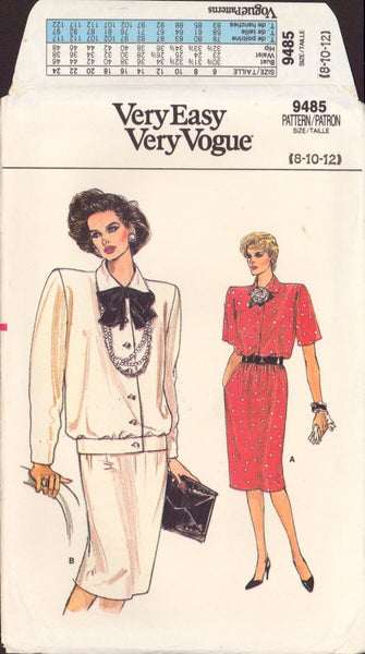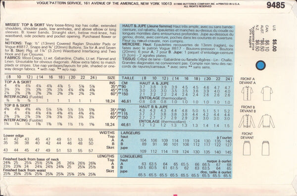 Vogue 9485 Sewing Pattern, Women's Top and Skirt, Size 8-10-12, Uncut, Factory Folded
