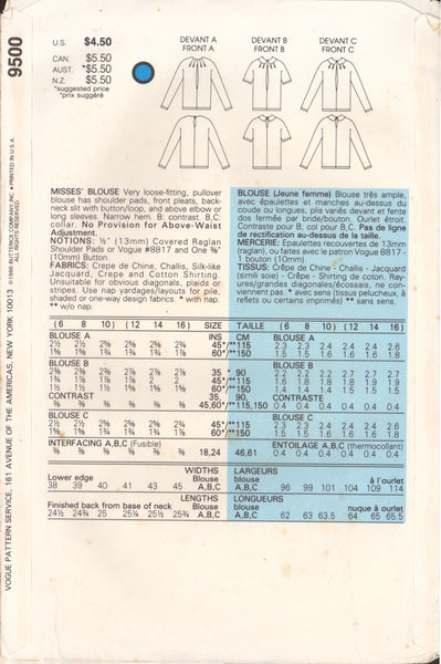 Vogue 9500 Sewing Pattern, Blouse, Size 14, Cut, Incomplete