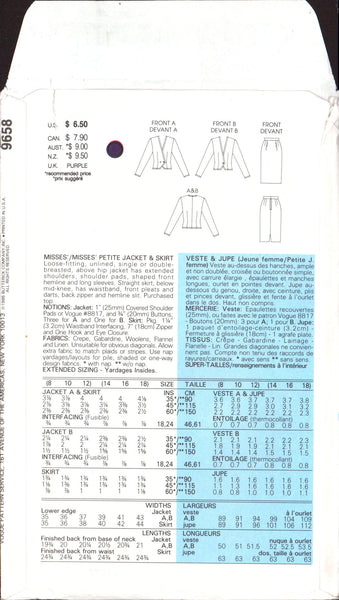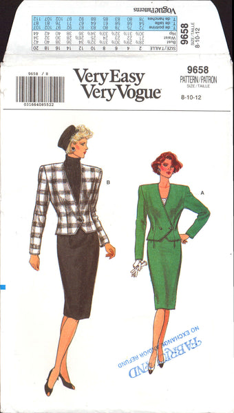 Loose fitting, unlined, single or double breasted, above hip length jacket with extended shoulder, shoulder pads, shaped front hemline and long sleeves. Straight skirt, below mid-knee, has waistband, front pleats and darts, back zipper and hemline slit.