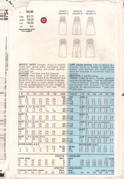 Vogue 9754 Sewing Pattern Skirt Size 14-16-18 Uncut Factory Folded