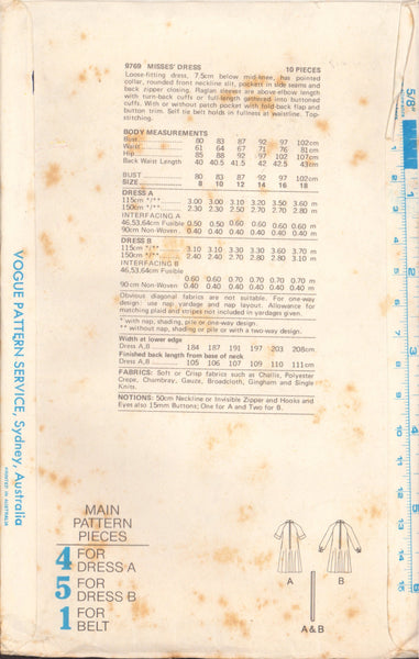 Loose-fitting dress, three inches below mid-knee, has pointed collar, rounded front neckline slit, pockets in side seams and back zipper closing. Raglan sleeves are above-elbow length with turn-back cuffs or full-length gathered into buttoned cuffs. With or without patch pockets with fold-back flap and button trim. Self tie belt holds in fullness at waistline. Topstitching.