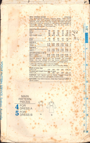 Loose fitting pullover blouson dress three inches below mid knee with front gathered into self lined yoke, oval neckline, back button and loop closing, extended shoulders, elasticized waist, pockets in side seams and sleeveless or full length sleeves. Can be worn with belt and top.