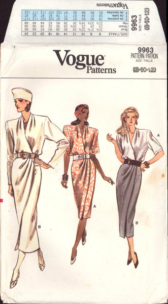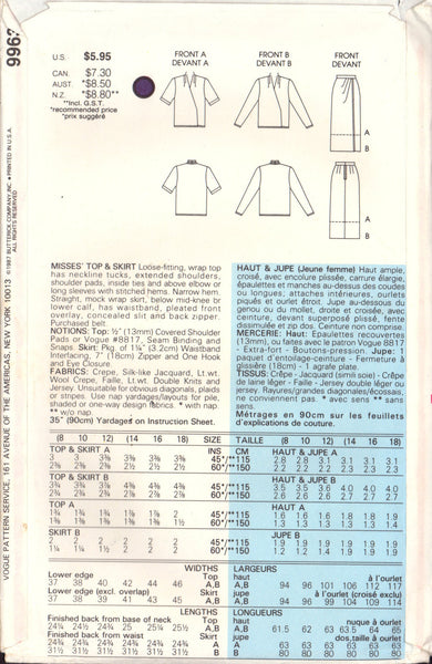 Loose-fitting, wrap top has neckline tucks, extended shoulders, shoulder pads, inside ties and above elbow or long sleeves with stitched hems. Narrow hem. Straight mock wrap skirt, below mid-knee or lower calf, has waistband, pleated front overlay, concealed slit and back zipper. Purchased belt.