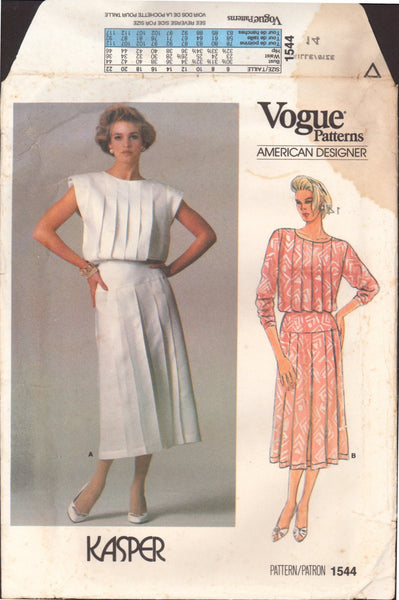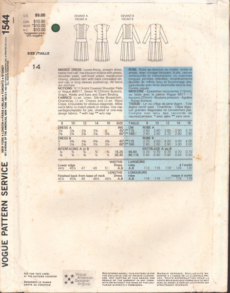 Loose-fitting, straight dress, below mid-calf, has blouson bodice with pleats, shoulder pads, self-lined yokes, back button closing, pleated skirt with back concealed slit, and cap or long sleeves pushed-up. All hems are stitched.