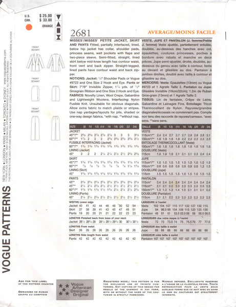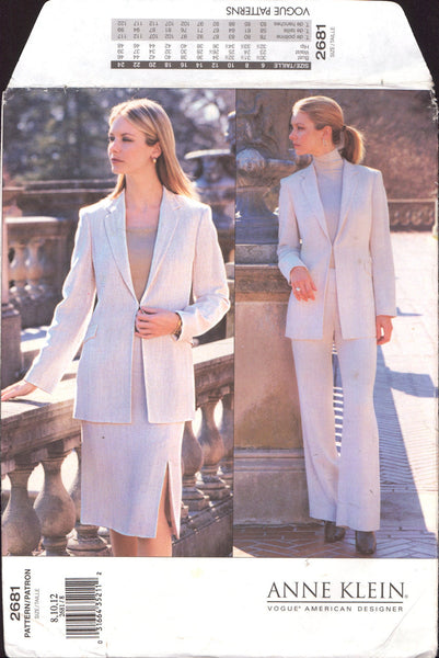 Fitted, partially interfaced, lined, below hip jacket has collar, shoulder pads, princess seams, welt pockets with flaps and two-piece sleeve. Semi-fitted, straight, lined skirt below mid-knee length has contour waist, front vent and back zipper. Straight-legged, lined pants have contour waist and back zipper.