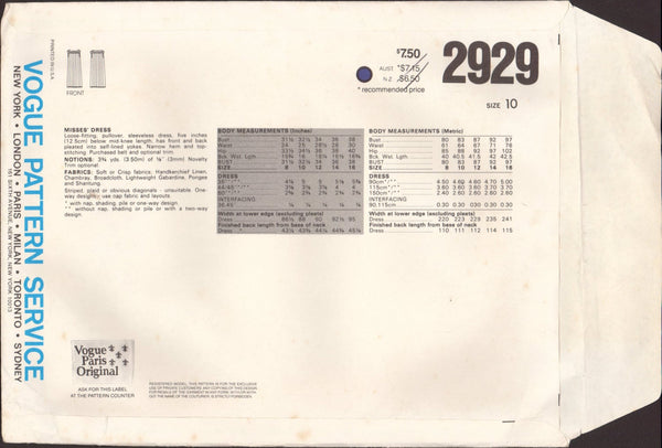 Loose fitting, pullover, sleeveless dress, five inches (12.5 cm) below mid-knee length, has front and back pleated into self lined yokes. Narrow hem and top stitching. Purchased belt and optional trim.