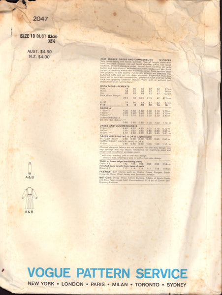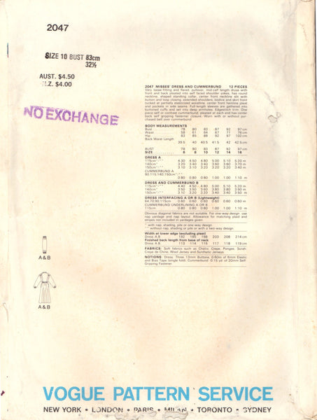 Very loose-fitting and flared pullover, mid-calf length dress with front and back pleated into self-faced shoulder yokes, has round neckline, shaped standing collar, center front neckline slit with button and loop closing, extended shoulders, bodice and skirt front tucked at partially elasticised waistline, center front hemline pleat and pockets in side seams. Full length sleeves are gathered into buttoned cuffs and set into deep armholes. Edgestitch trim.
